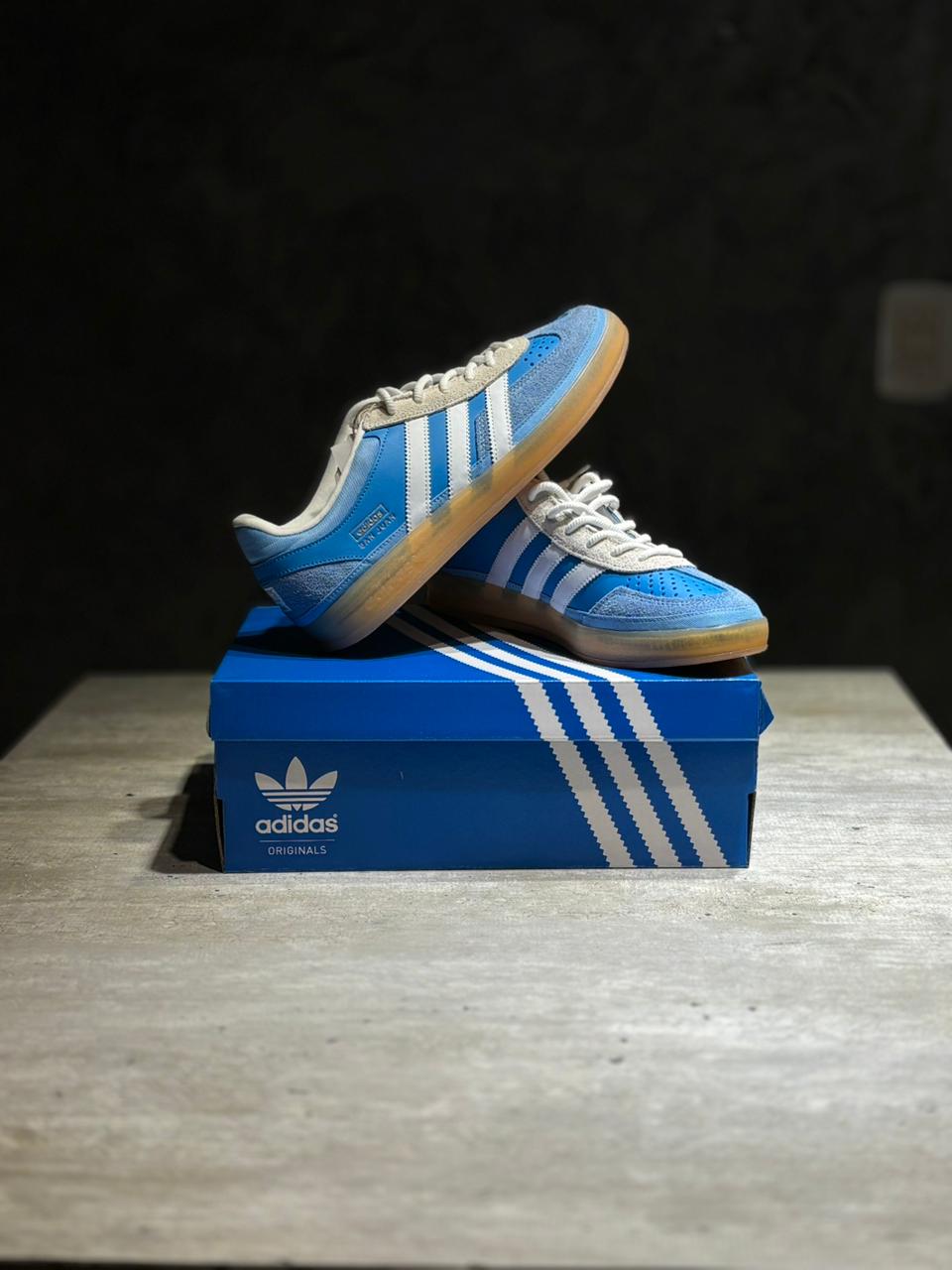 Adidas Gazelle x Bad Bunny “San Juan” en tonos celeste y azul, con capas superpuestas y suela gum translúcida. Una colaboración icónica que fusiona herencia clásica y diseño moderno.